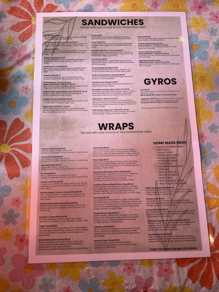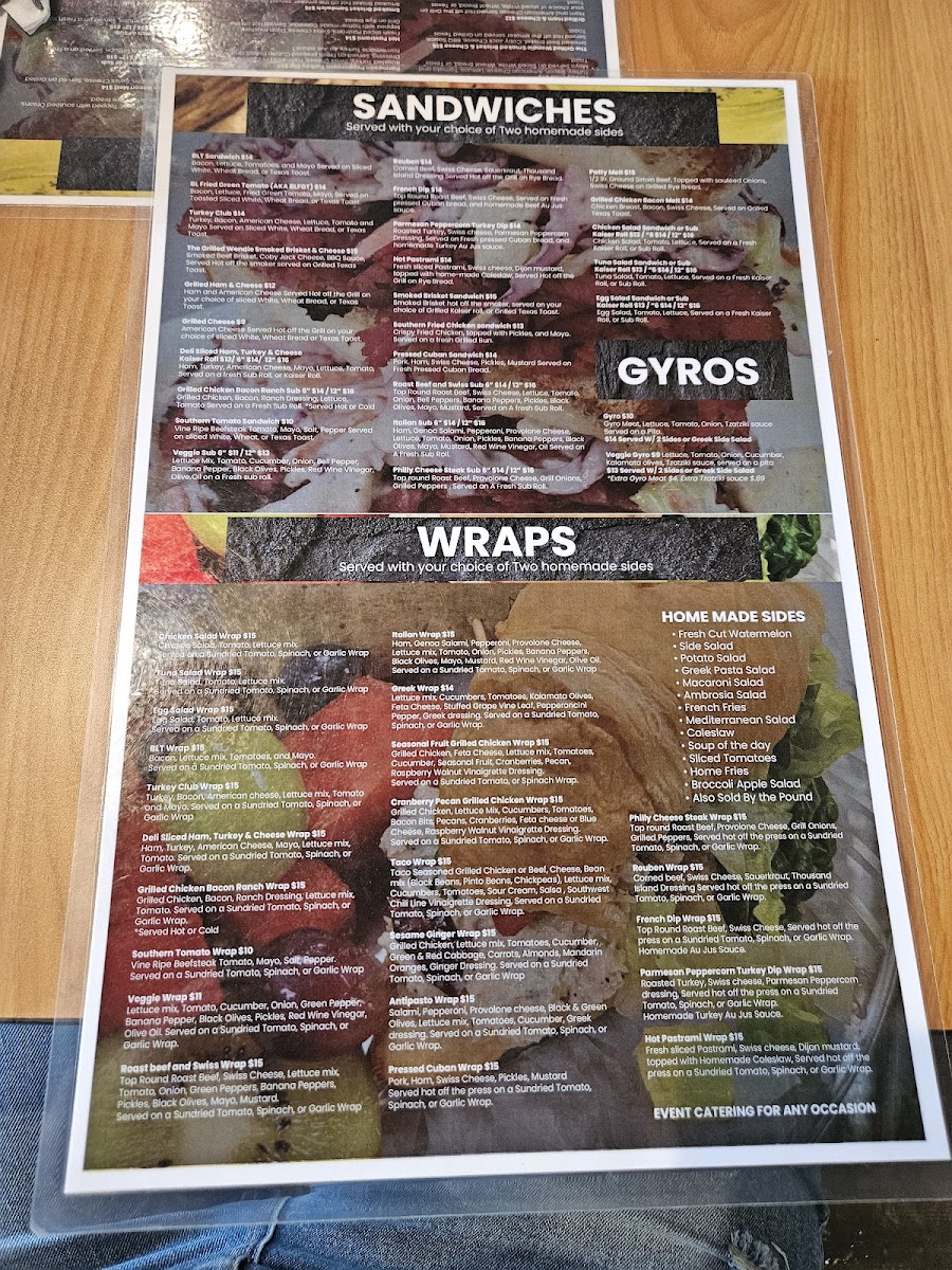 Ham, Genoa Salami, Pepperoni, Provolone Cheese, Lettuce mix, Tomato, Onion, Pickles, Banana Peppers, Black Olives, Mayo, Mustard, Red Wine Vinegar, Olive Oil. Served on a Sundried Tomato, Spinach, or Garlic Wrap. Served with your choice of 2 homemade sides.